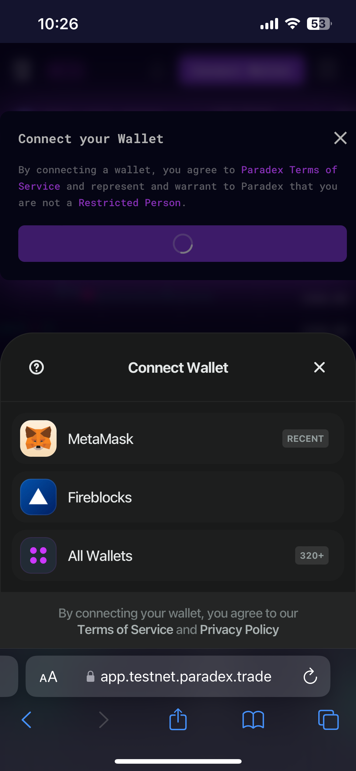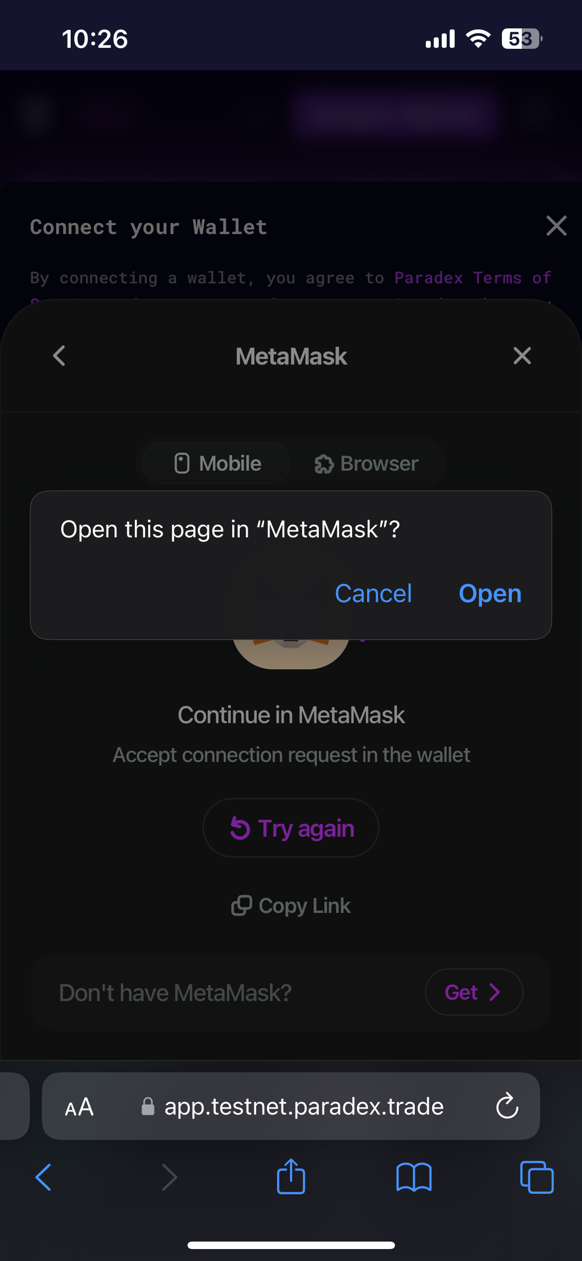 If your wallet does not offer mobile apps (eg. Rabby), you will not be able to use our Paradex mobile app. We are actively working on alternative login methods for this use case.