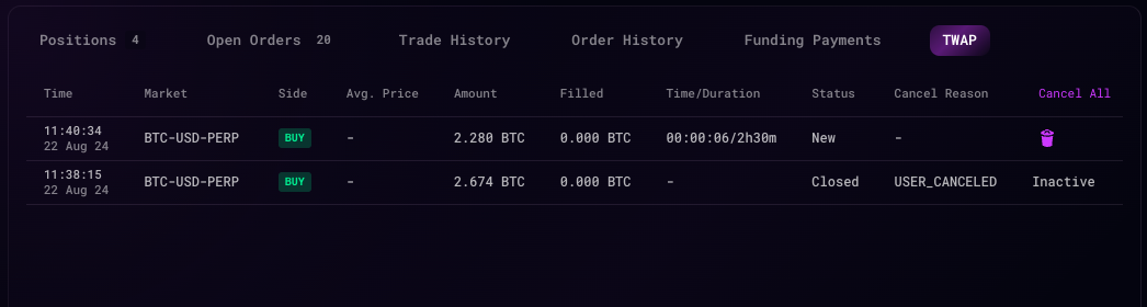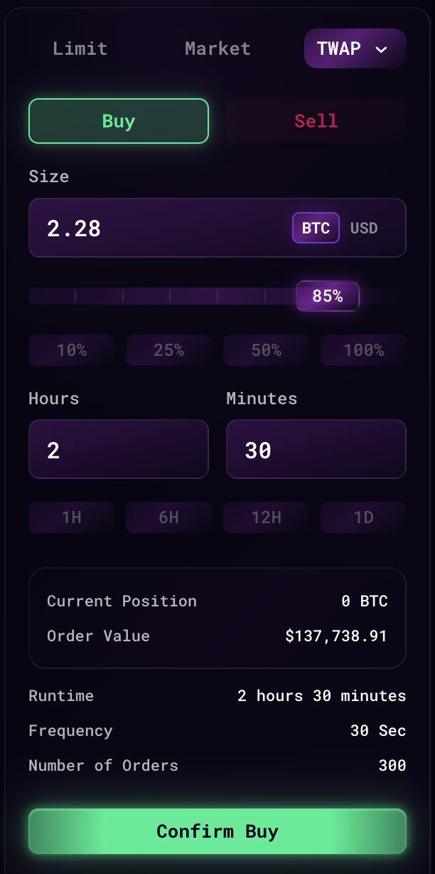 - Hours and Minutes - Total runtime of the TWAP order