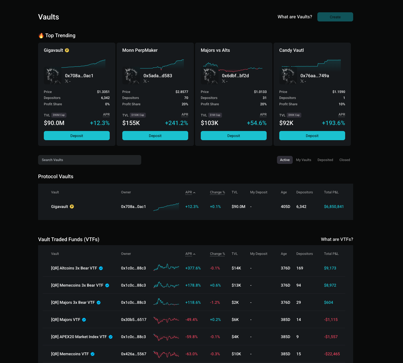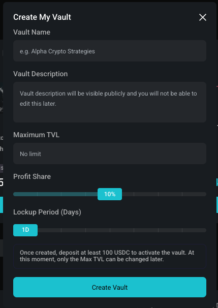 TradingVaultsTutorialsCreate a VaultCopy page1CreateGo to https://app.paradex.trade/vaults, click on the “Create” button on the top right hand corner.2Enter DetailsEnter the details to Create your Vault3Initial DepositFollow the steps in deposit to activate your vault with a first deposit
