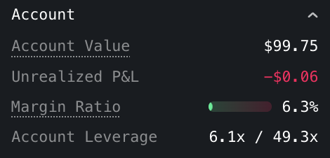 This maximum leverage depends on the account maximum leverage per market. It represents the maximum allowed Effective Leverage beyond which the account will be unable to submit new orders that increase open notional.