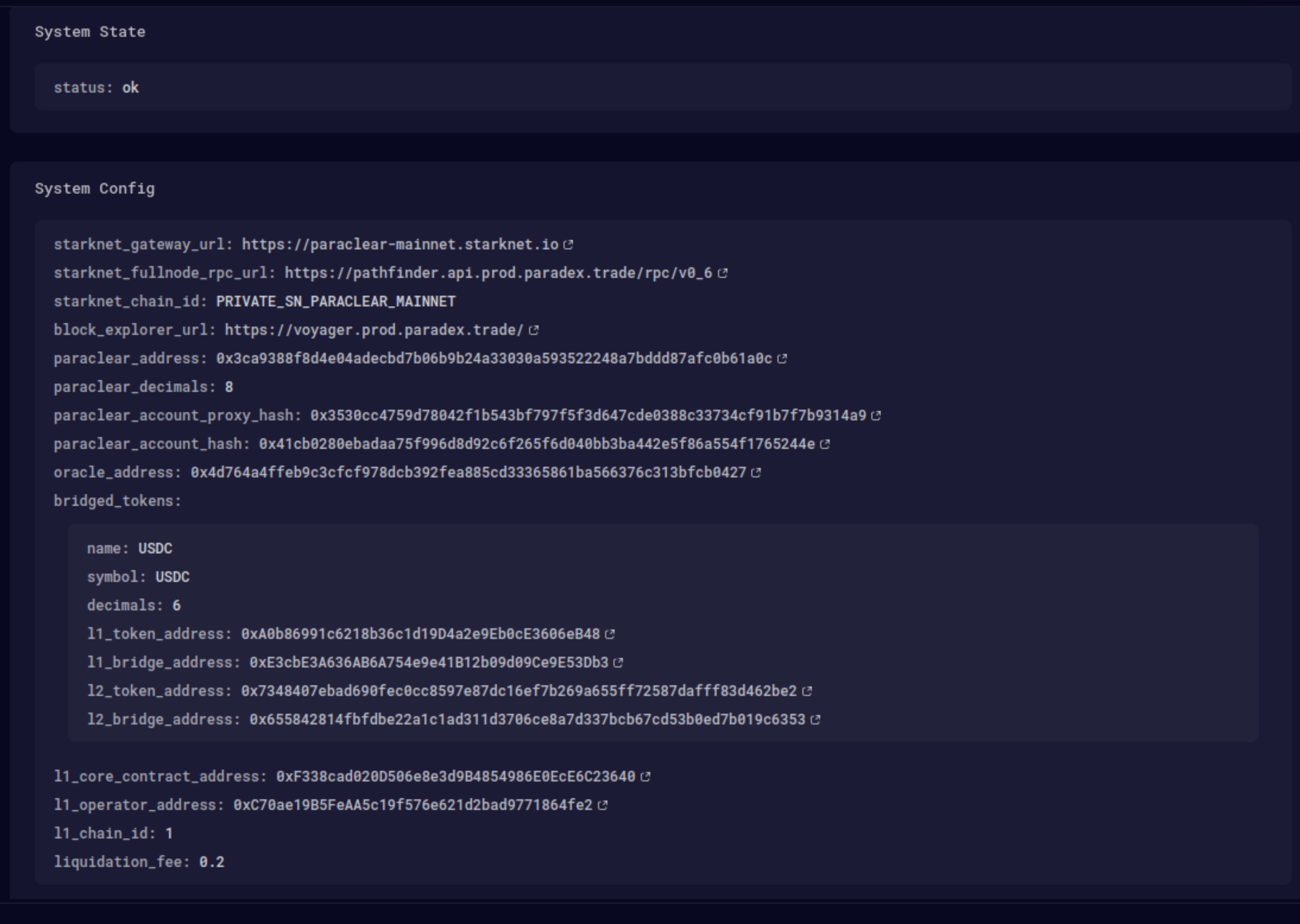 Paradex shows up-to-date chain information at https://app.paradex.trade/status like the following: