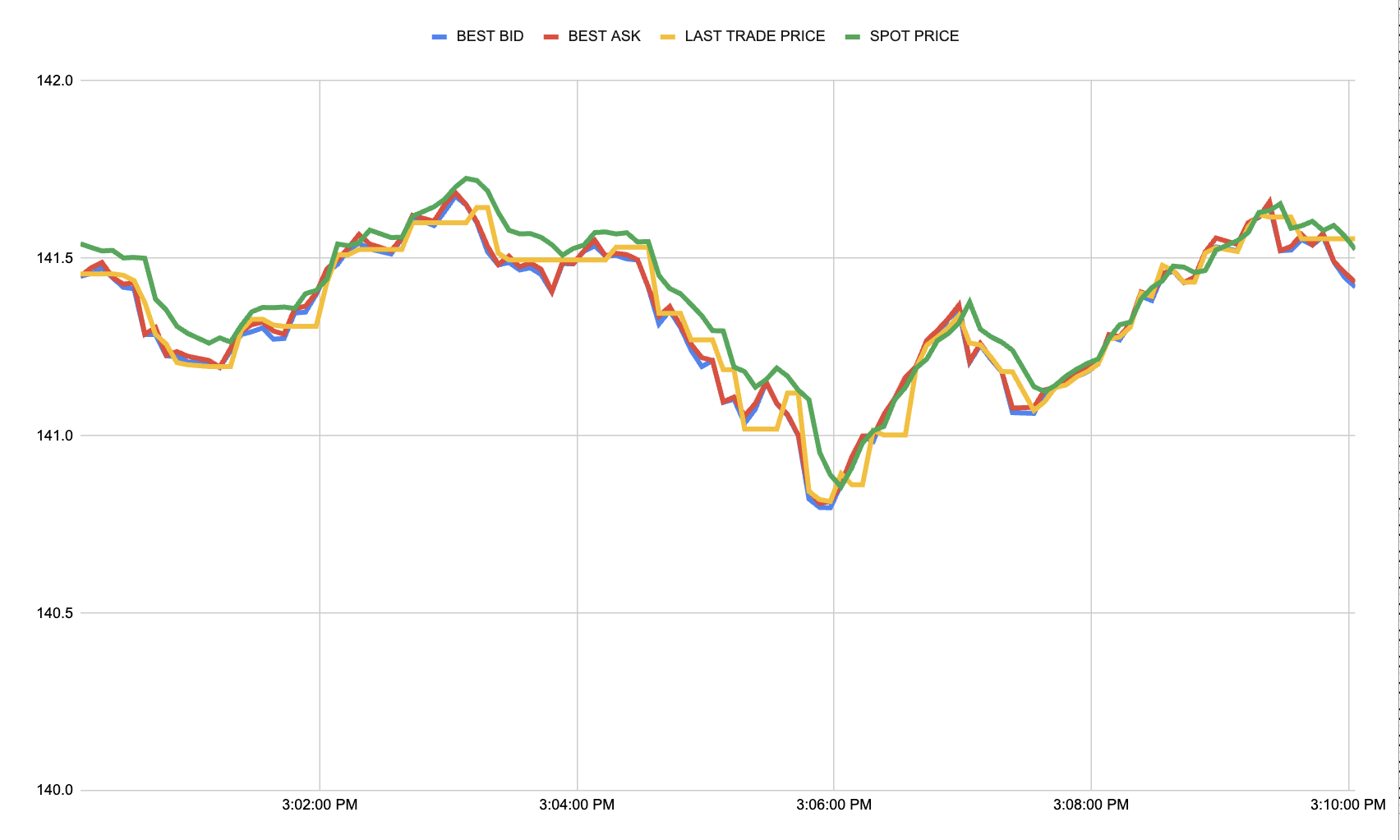 - 1. Every 5 seconds, get the latest Best Ask, Best Bid, Last Trade and Spot Prices