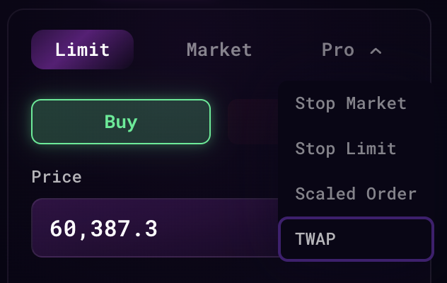 TWAP - or Time Weighted Average Price - allows you to split a large order up to be executed over a period of time, so that you fill your orders over an average price.