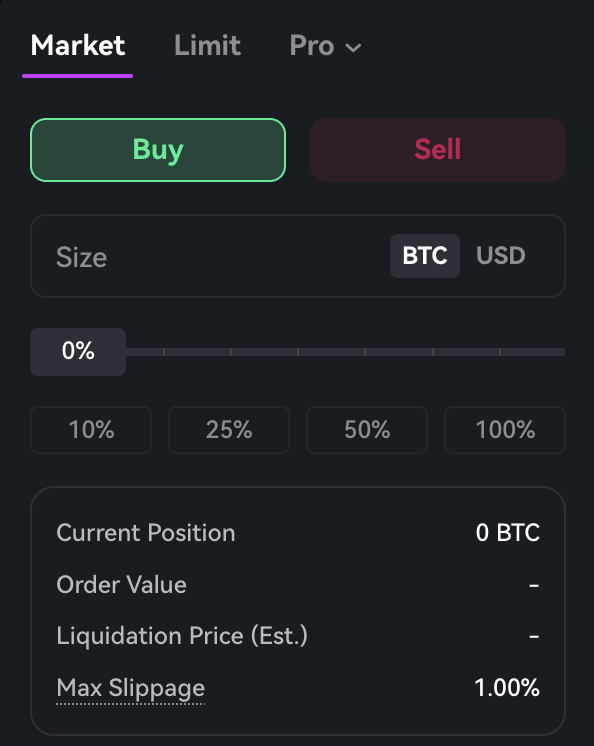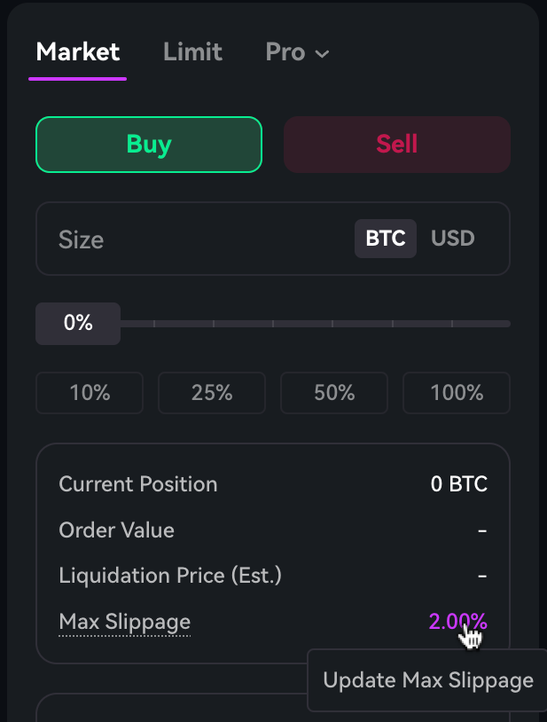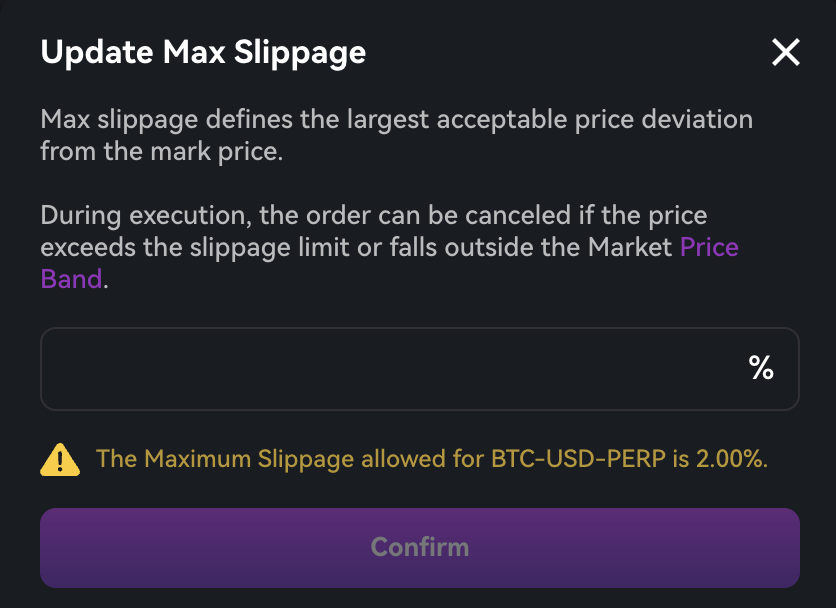- Some markets have max cap of slippage percentage (In this case BTC-USD-PERP has max slippage of 2%)