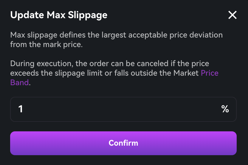 Max slippage defines the largest acceptable price deviation from the best bid/ask price.