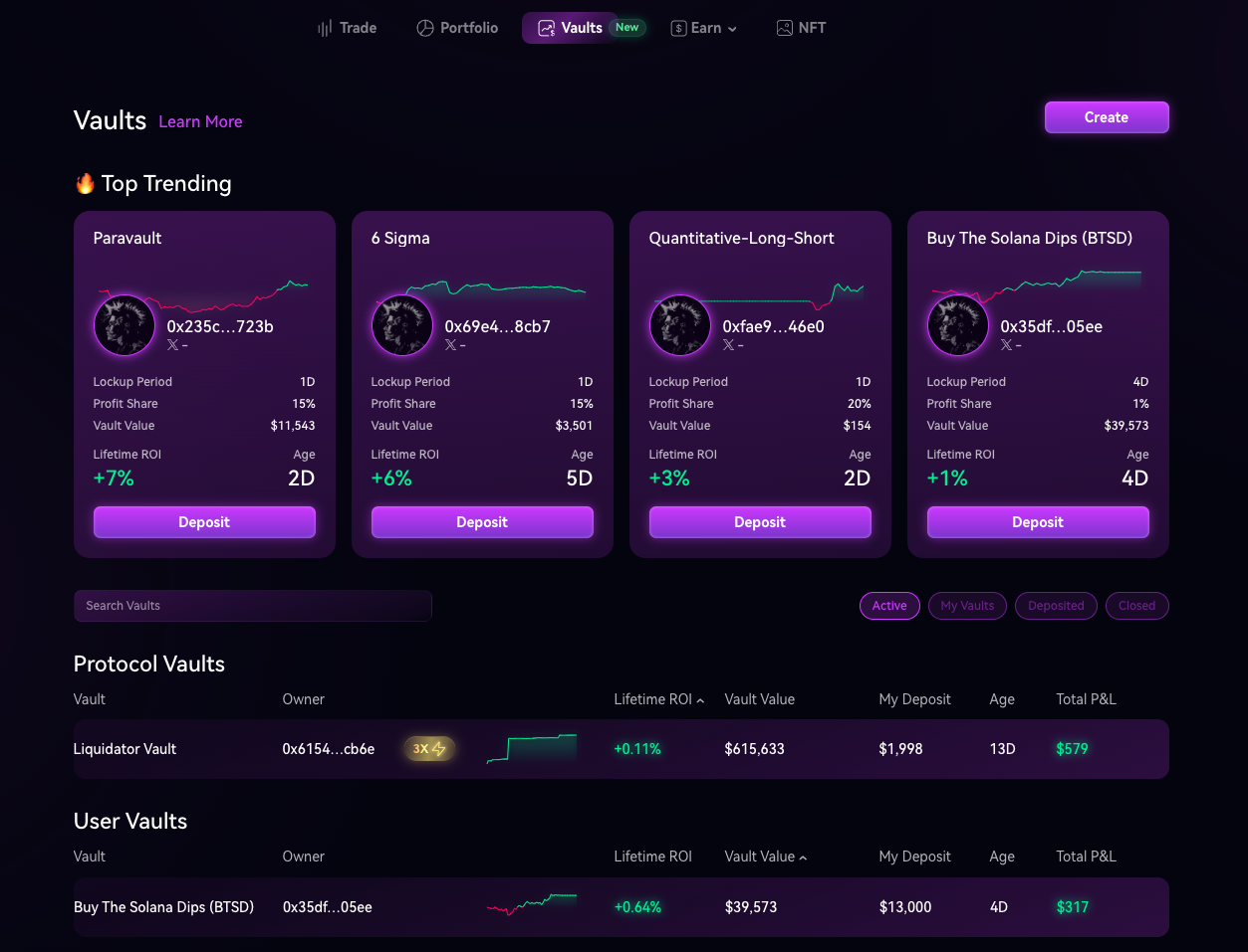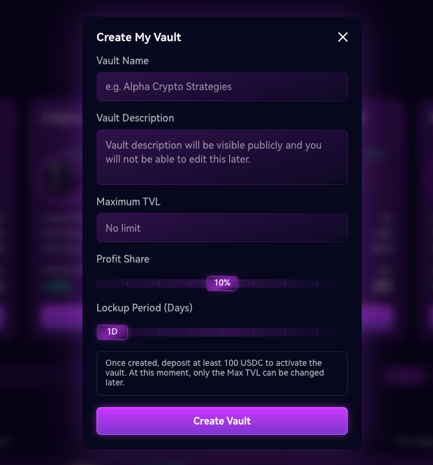 TradingVaultsTutorialsCreate a VaultCopy page1CreateGo to https://app.paradex.trade/vaults, click on the “Create” button on the top right hand corner.2Enter DetailsEnter the details to Create your Vault3Initial DepositFollow the steps in deposit to activate your vault with a first deposit