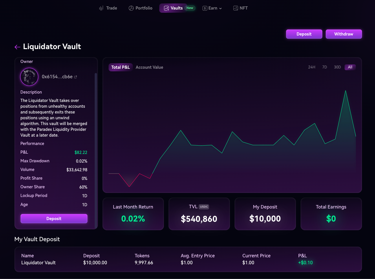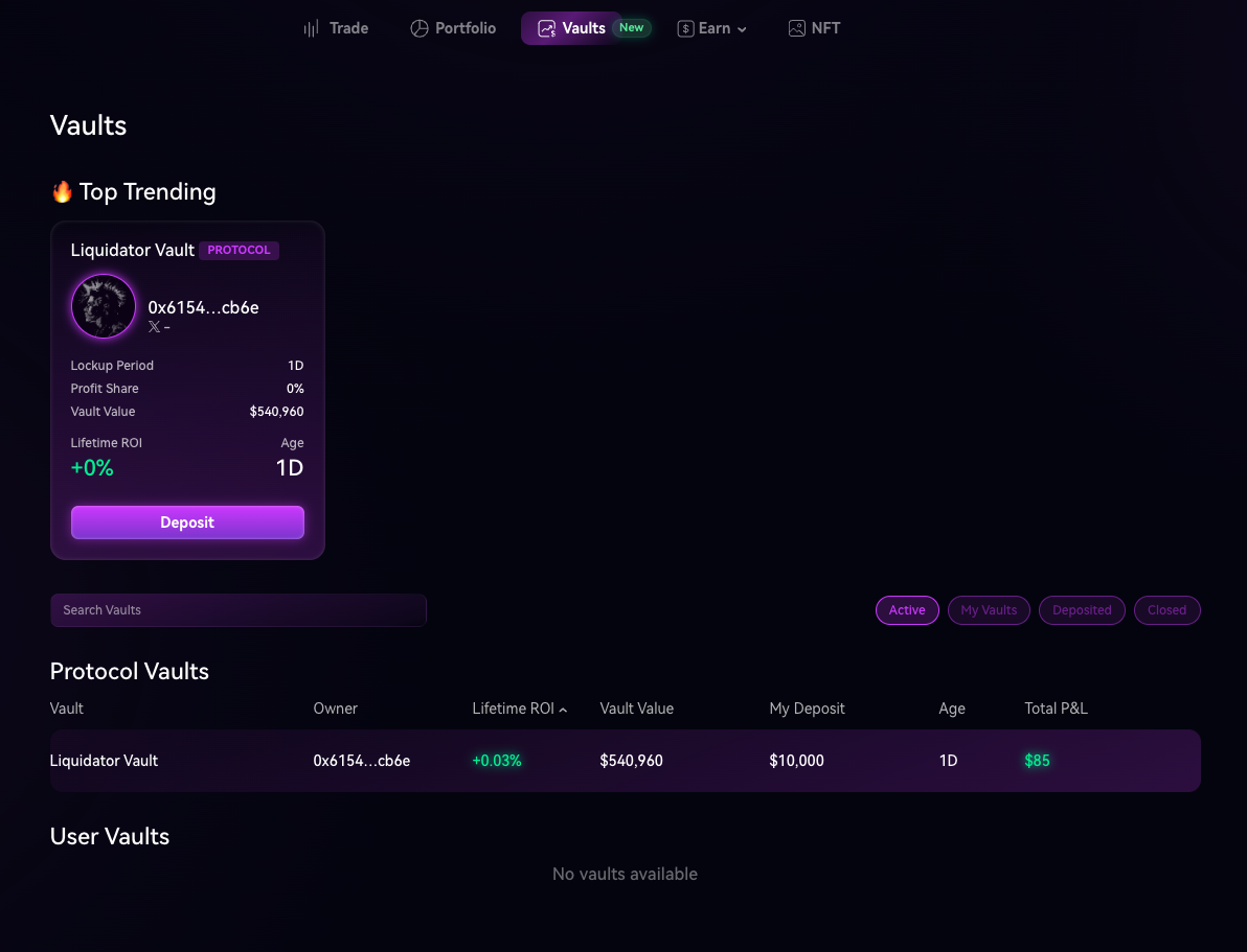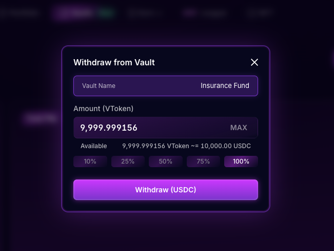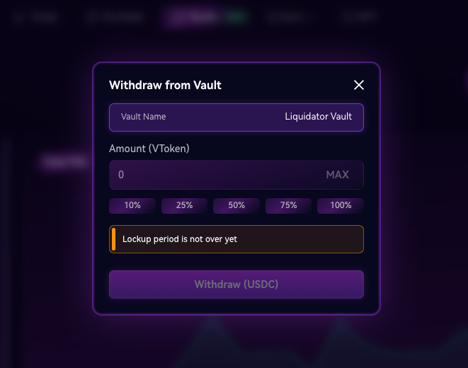 TradingVaultsTutorialsWithdrawalCopy page1Select a VaultSelect a Vault on the Vaults page that you wish to withdraw from.2Click on "Withdraw"Click on the “Withdraw” button on the top right hand corner.3Enter Amount and ConfirmInput the Amount and click “Withdraw (USDC)”.4Check Lockup PeriodYou will not be able to withdraw from the Vault if your minimum lockup period is not over yet.